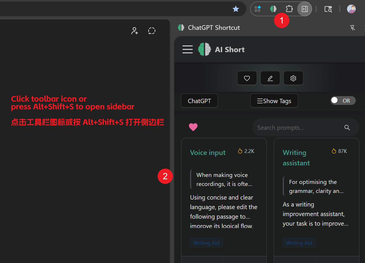 瀏覽器擴充功能如何使用瀏覽器擴展本頁導覽如何使用瀏覽器擴展? ChatGPT Shortcut 支持 13 種主流語言,擴展語言將根據你的瀏覽器環境自動設置。你也可以在設置頁面手動更改語言。 顯示模式 擴展支持三種顯示模式: 側邊欄模式:在瀏覽器側邊欄中打開,可與網頁內容並排顯示 彈窗模式:點擊擴展圖標後以彈窗形式顯示 獨立窗口模式:在獨立的浮動窗口中打開 保持側邊欄打開 開啓此選項後,側邊欄將在瀏覽器標籤頁切換時保持開啓狀態,方便持續使用。 深色模式 擴展支持深色模式,可在設置頁面中開啓"深色模式"選項,啓用後界面將切換爲深色外觀。 熱鍵激活 使用 Alt+Shift+S 快捷鍵可以直接激活擴展。